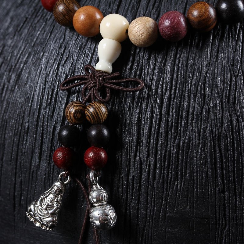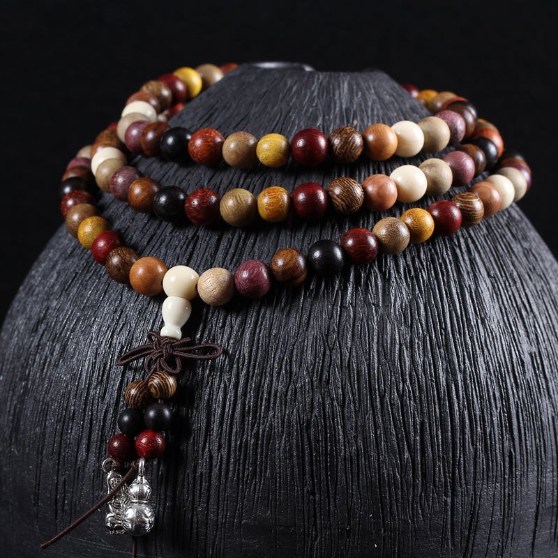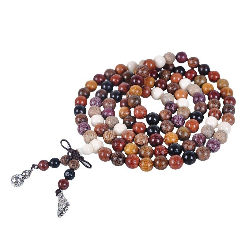 Material and Color: It is composed of beads made from various types of wood such as sandalwood, rosewood, and thuja, presenting rich colors and textures including red, brown, yellow, white, and black. The color and wood grain of each bead are unique.